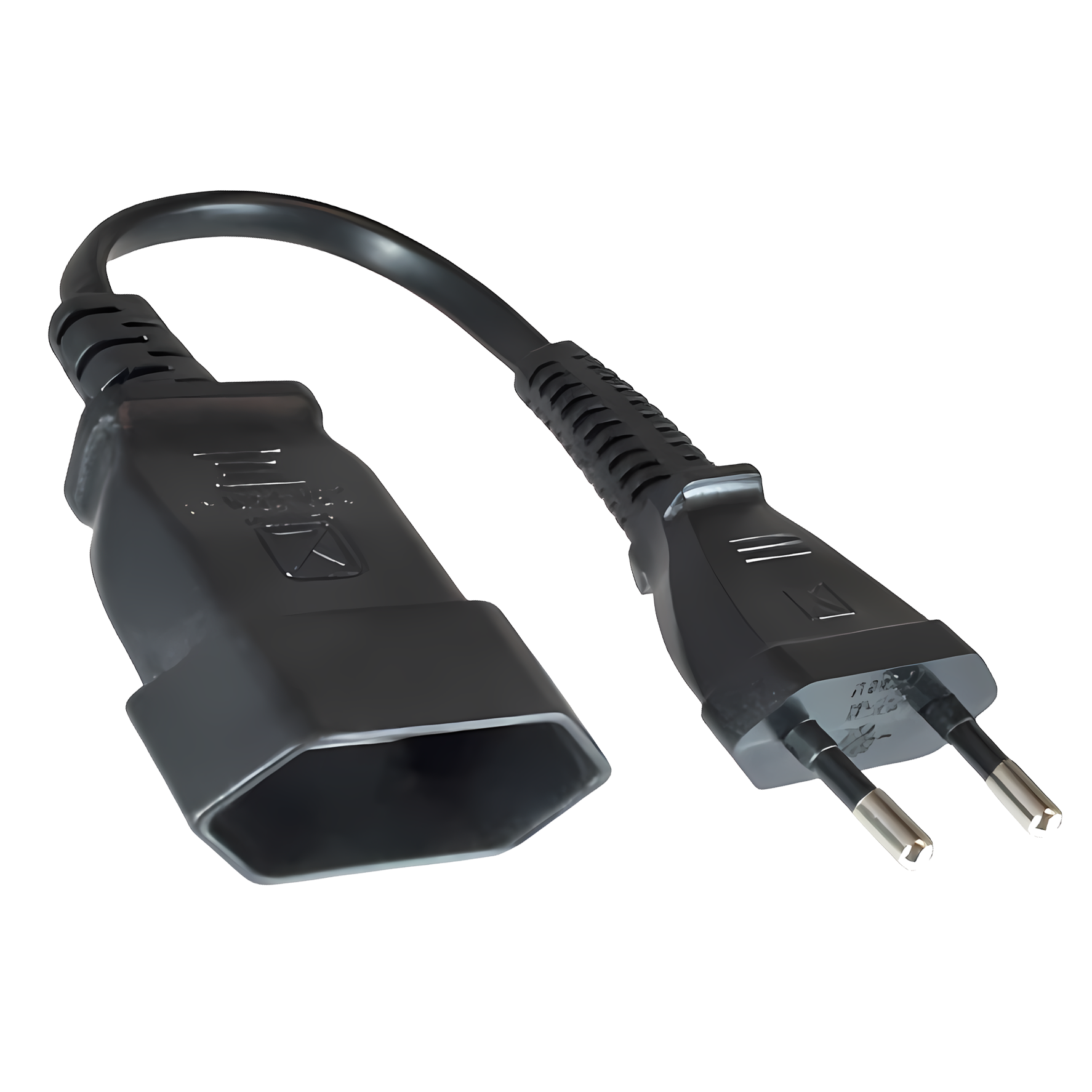 - kleiner flacher Euro-Stecker (CEE 7/16, Typ C / in Schweiz Typ 26) auf entsprechende Euro-Buchse