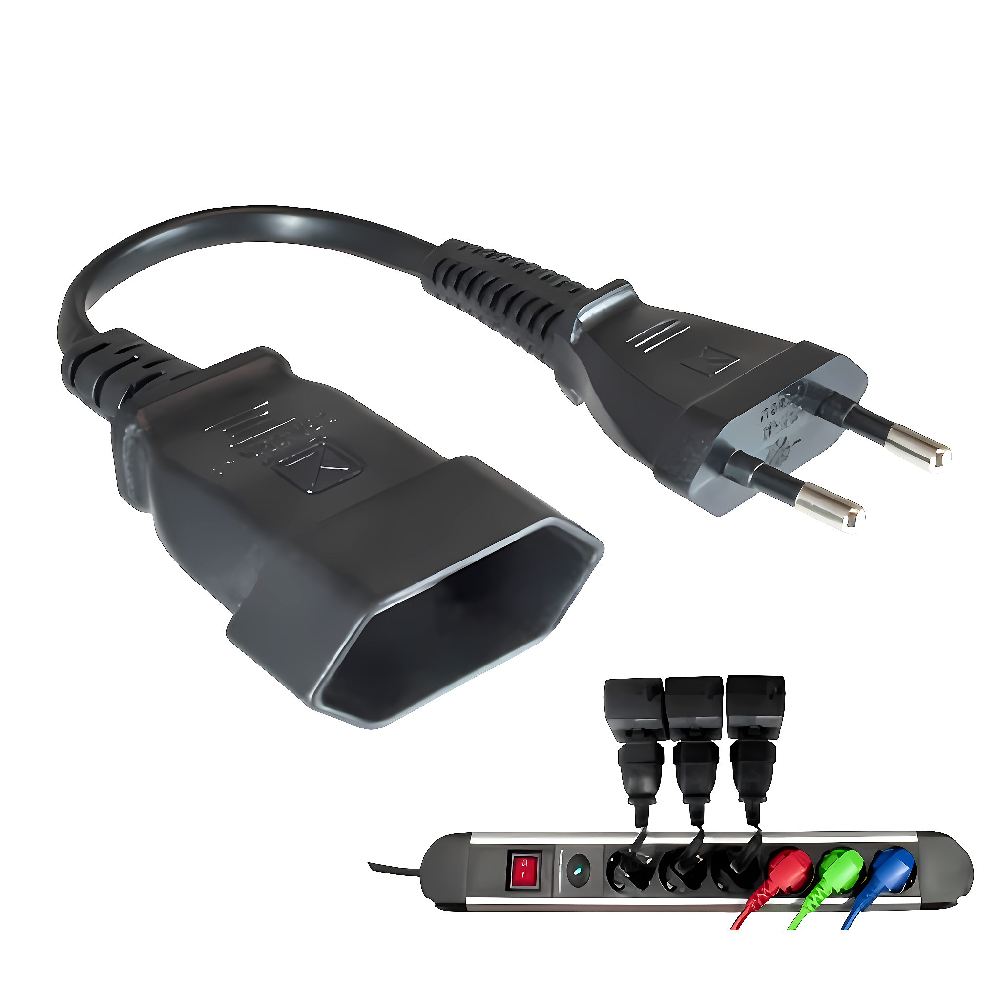 Das Kabel ist auf der Strom-Netzseite mit einen sog. Eurostecker (CEE 7/16, Typ C / in Schweiz Typ 26) ausgestattet. Dieser flache Steckertyp kann mit Ausnahme von UK, Irland, Malta und Zypern in ganz Europa eingesetzt werden, daher "Euro". An der anderen Seite hat das Kabel die entsprechende Euro-Buchse in die Sie z.B. ein Steckernetzteil einstecken können.