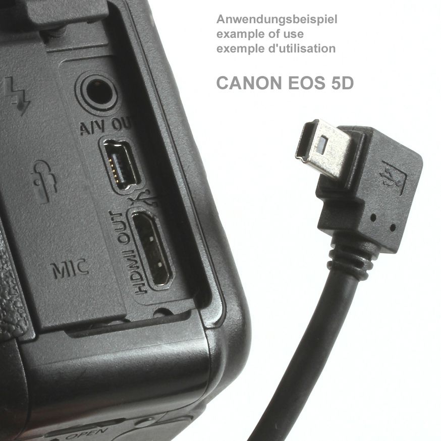 Der 90° Winkelstecker ist besonders klein konzipiert. Der Steckerüberstand beträgt nur ca. 13mm. Dieses spart nochmals Platz. On Top wird die USB-Mini-Buchse des Gerätes (z.B. DSLR-Kamera) durch verringerte Hebelwirkungen geschont. Ein Zug am Kabel wirkt durch die Winkelung nicht mehr so stark auf die empfindliche Mini B Buchse am Gerät.