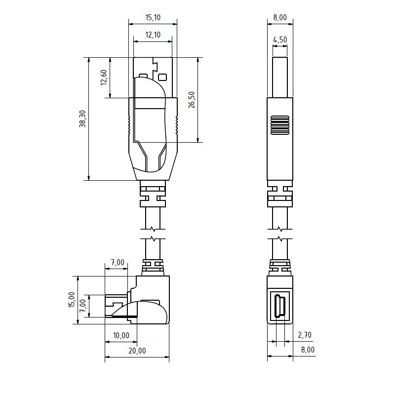 - besonders kleine, abgewinkelte Mini B Steckerbauform