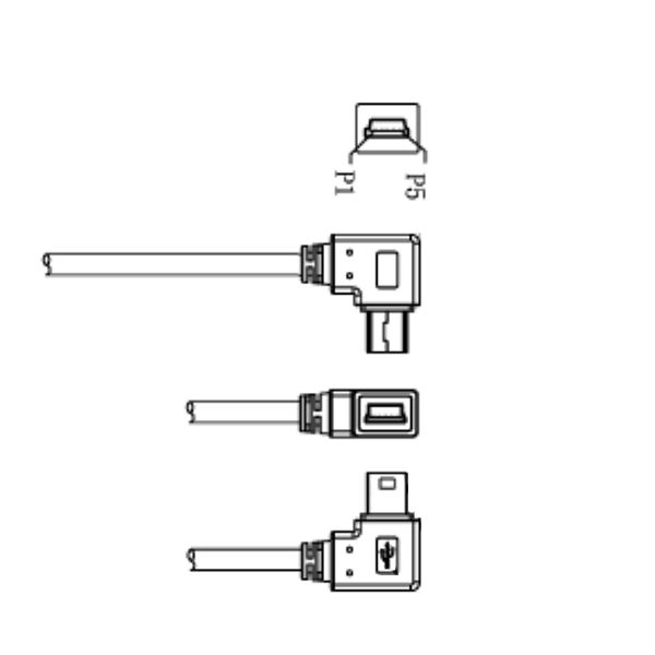 - ANSCHLUSS 1: USB 2.0 Stecker Typ Mini-B 90° gewinkelt RECHTS (an peripheres Gerät / downstream)
