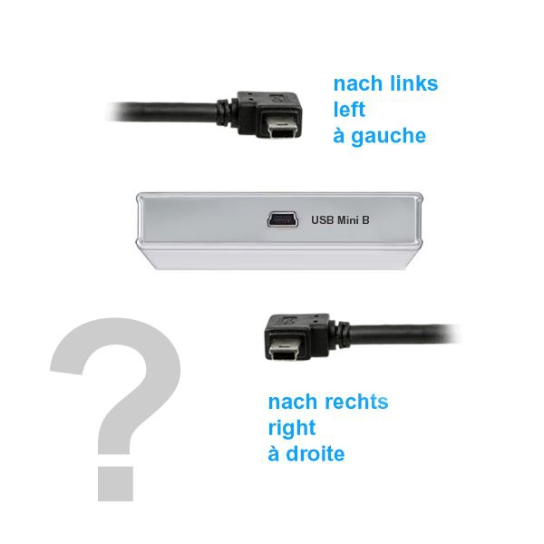 Wir bezeichnen das Kabel als 90° NACH RECHTS gewinkelt. Ob NACH RECHTS bei Ihrem Gerät tatsächlich stimmt, ist aber von der Position des Mini-B-Buchse des USB-Gerätes abhängig. Bitte prüfen Sie daher die Lage des Mini-B-Ports Ihres USB-Gerätes. Die Mini-B-Buchse ist trapezförmig. Zur Verdeutlichung der 90° Winkelrichtung haben wir oben ein Erläuterungsbild.