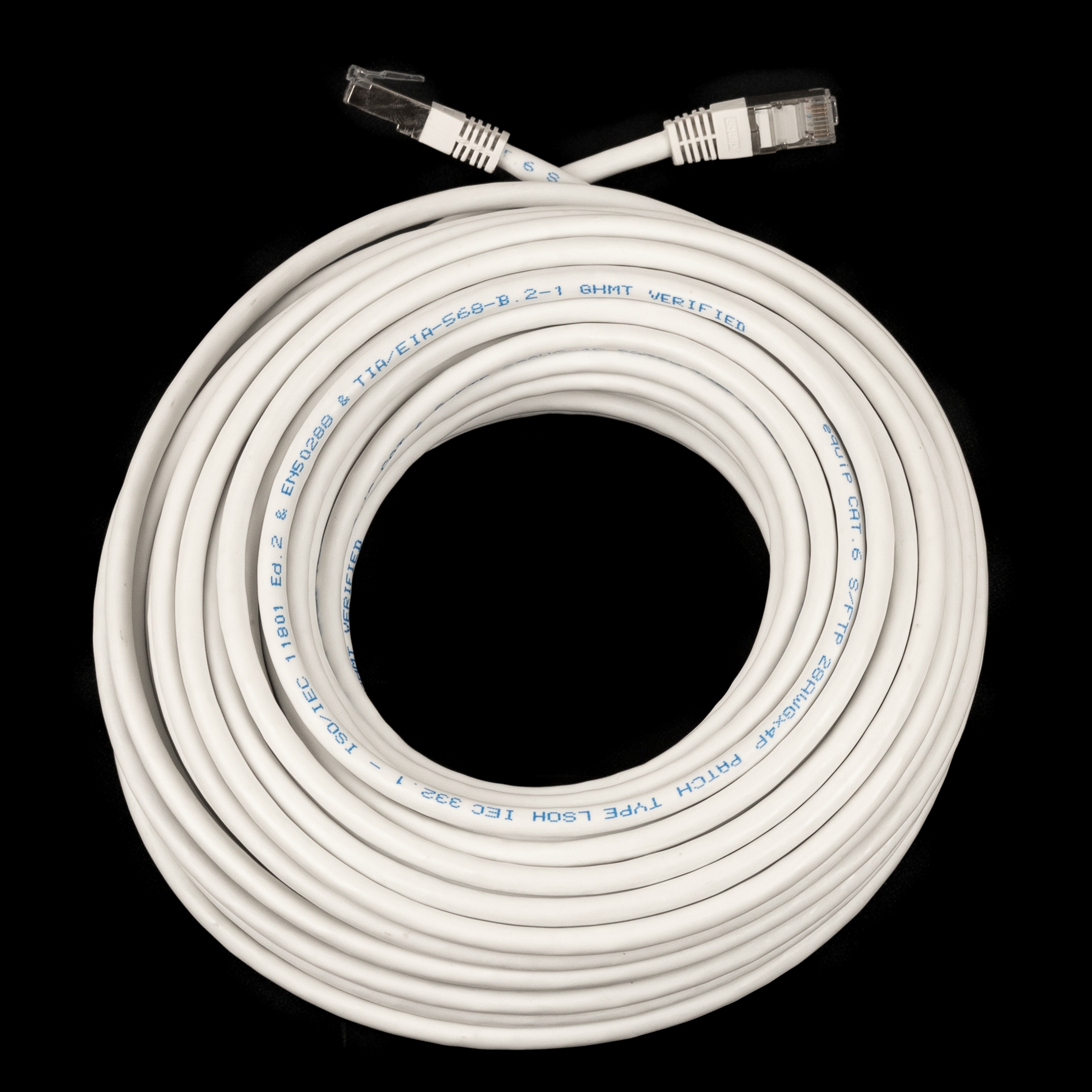 Cat.6 Netzwerkkabel / Patchkabel, 20m, Vollkupfer-Litzen, 2-fach Schirmung S/FTP (PIMF), 250Mhz, halogenfreier Mantel (LSZH), Gigabit-fähig, 2x RJ45-Stecker vergossen, weiß
