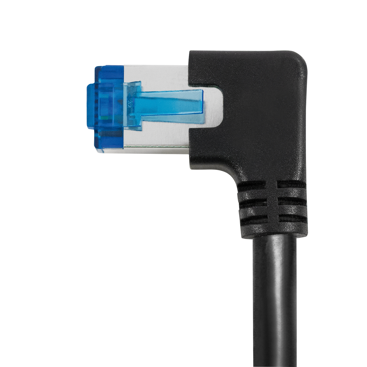 Netzwerkkabel Cat.6A, 1x RJ45 Stecker NACH LINKS 90° abgewinkelt, 1x Stecker RJ45 gerade, AWG26 (CU), S/FTP (PIMF), schwarz, 0.5m