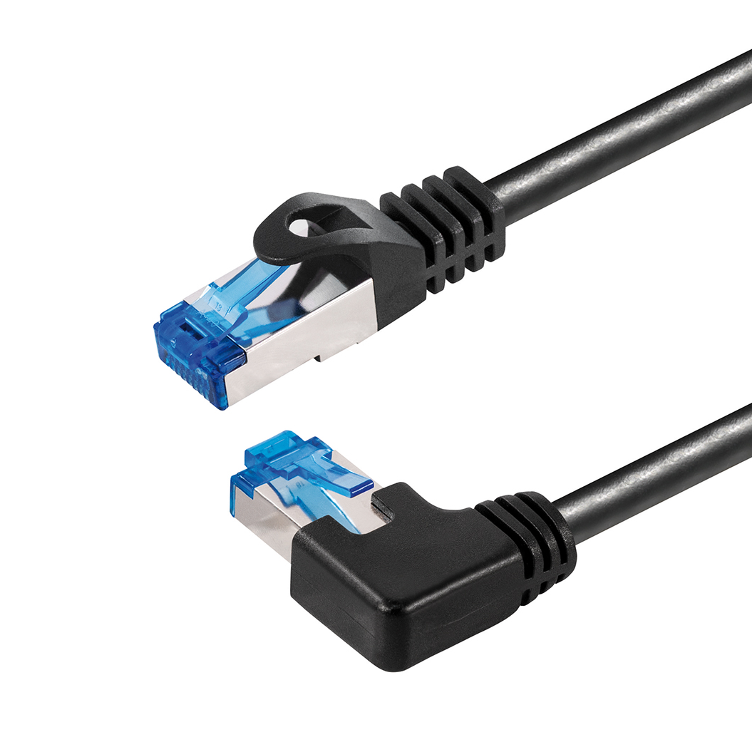 Netzwerkkabel Cat.6A, 1x RJ45 Stecker NACH RECHTS 90° abgewinkelt, 1x Stecker RJ45 gerade, AWG26 (CU), S/FTP (PIMF), schwarz, 1m
