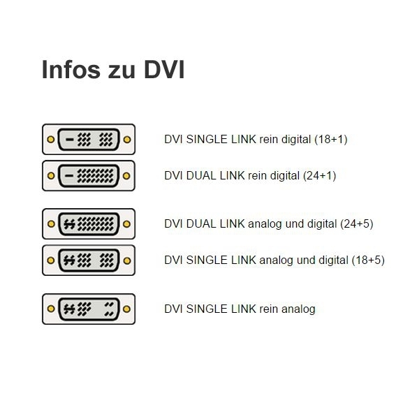 Kombinationskabel stellen ergänzend zu den digitalen Bildschirmsignalen auch die klassischen analogen Signale über zusätzliche Pins (XX+5) zur Verfügung. Zudem werden DVI-Kabel in DUAL LINK (24+X) und SINGLE LINK (18+X) unterschieden. Durch die Kombination dieser Merkmale ergeben sich vier DVI-Kabeltypen: