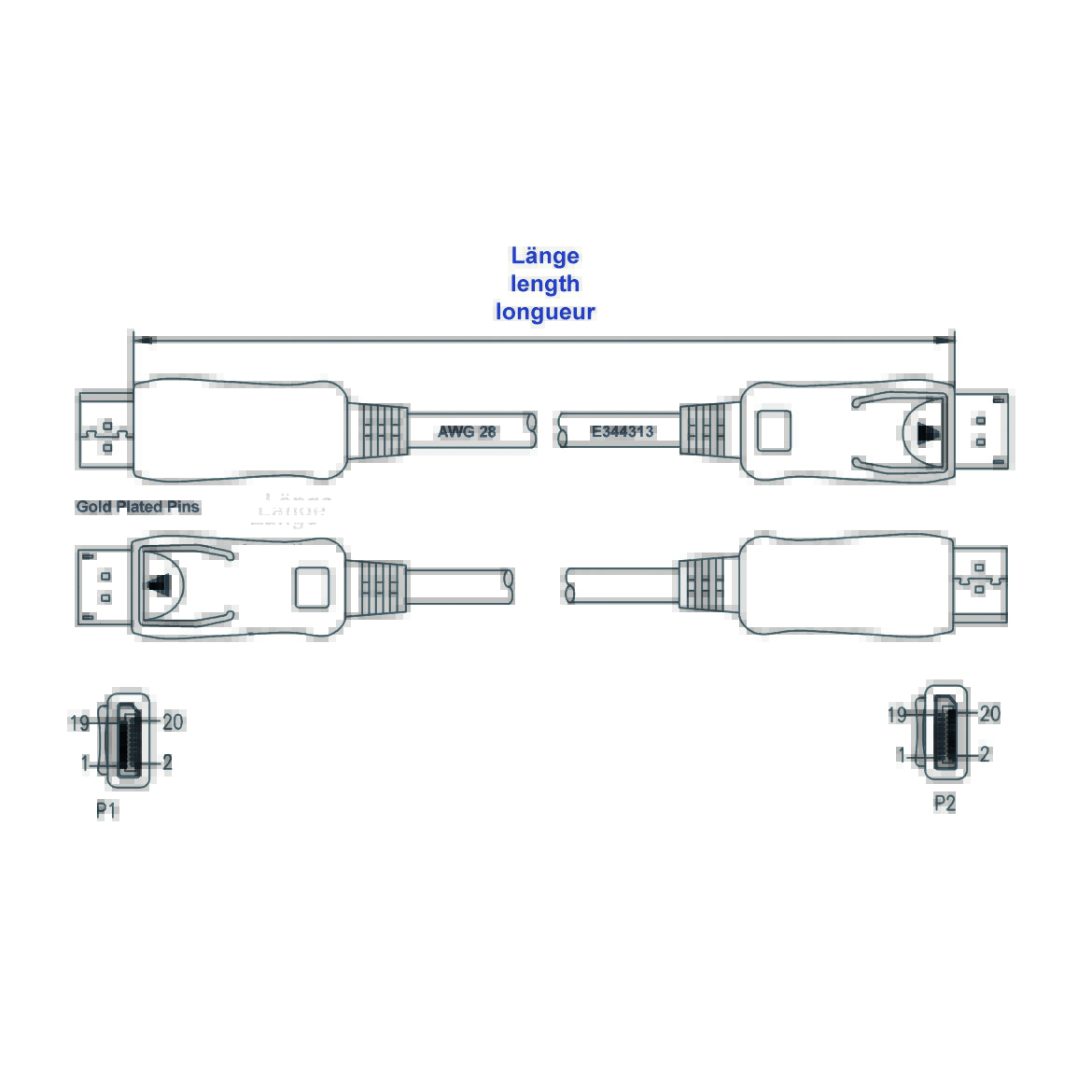 - beidseitig DisplayPort™-Stecker (männlich, 20-polig)