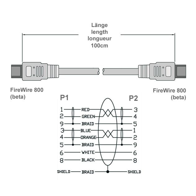 Das IEEE1394b-Kabel ist mit zwei 9-poligen Steckern ausgestattet und stellt Bus-Power zur Verfügung.