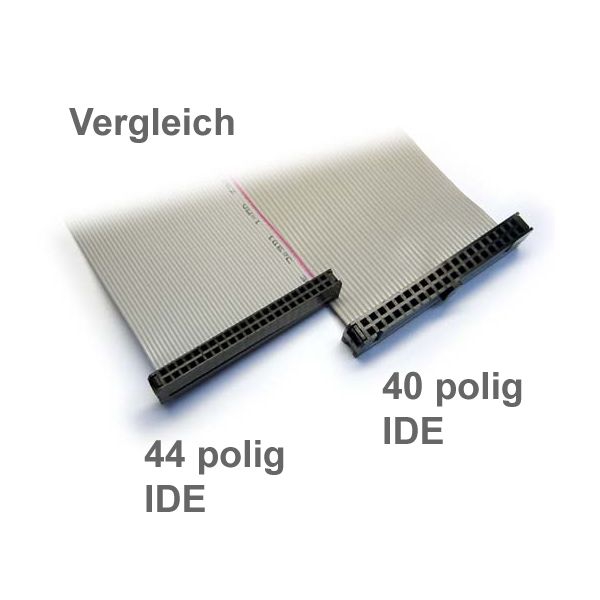 Das Mini-Flachband-Kabel ist z.B. für den internen Anschluß von 2.5" IDE-Festplatten in einem Notebook, in Druckern oder für RetroComputing (z.B. AMIGA 1200) geeignet. Bei Mini-IDE-Kabeln für 2.5" Festplatten wird die Stromversorgung über das Flachbandkabel vorgenommen. Statt der normalen IDE-Adernanzahl von 40 haben diese feinadrigen Kabel daher 44 Adern. Zwei der vier zusätzlichen Adern dienen der Stromversorgung (+5 Volt und Masse). Leitung 1 (Kontakt 1) ist an IDE-Flachbandkabeln stets farblich gekennzeichnet (rot).