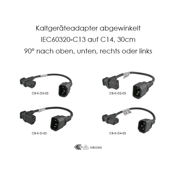 - Einseitig abgewinkeltes Kaltgeräte-Verlängerungskabel, Typ: Stecker/Buchse
