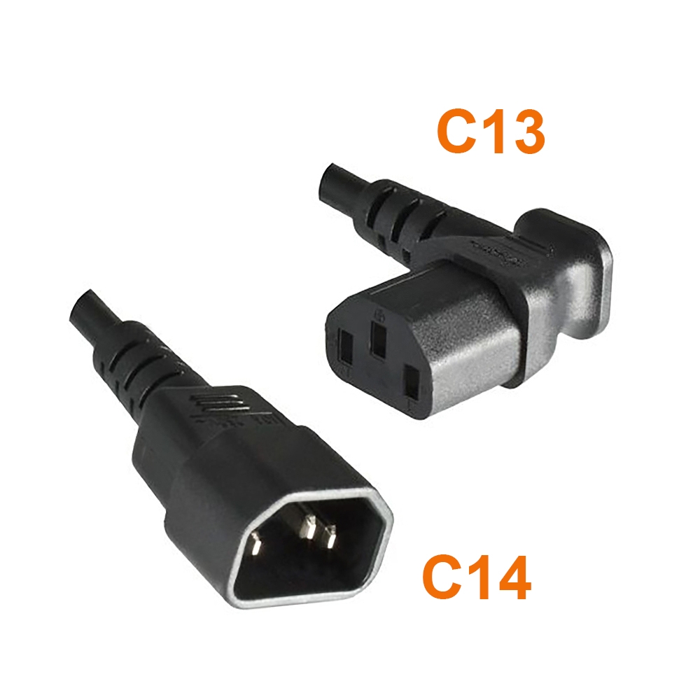 Der um 90° abgewinkelte Stecker C13 spart Platz z.B. im Serverschrank. C14 ist das Gegenstück zu C13. C14-Stecker werden z.B. bei den gepufferten Ports einer USV eingesteckt oder beim entsprechenden zweiten Port am PC-Netzteil (z.B. für Monitorstromversorgung).