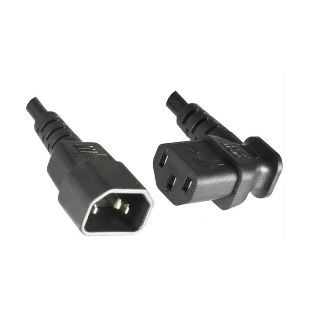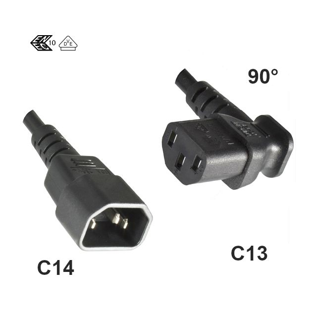 Kaltgeräteverbinder vom Typ IEC-60320 C13 werden für den Stromanschluss von Geräten verwendet, die im Betrieb keine oder kaum Wärme entwickeln. Dies sind z.B. PCs. Durch die 90° Winkelung sparen Sie Platz. Die maximale Temperatur des Steckers darf 70 °C nicht überschreiten und der maximale Stromdurchfluss ist auf 10 A festgelegt.