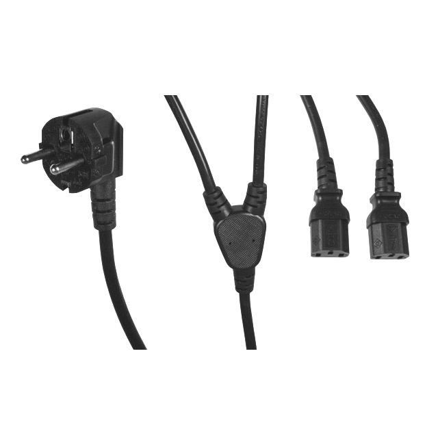 Kaltgeräte-Y-Verzweigungskabel für 2 Geräte, 1x Schutzkontakt-Stecker CEE 7/7 E+F (90° abgewinkelt) an an 2x Kaltgerätestecker C13, Gesamtlänge 2m (1,2 m + 2x 0,80 m)