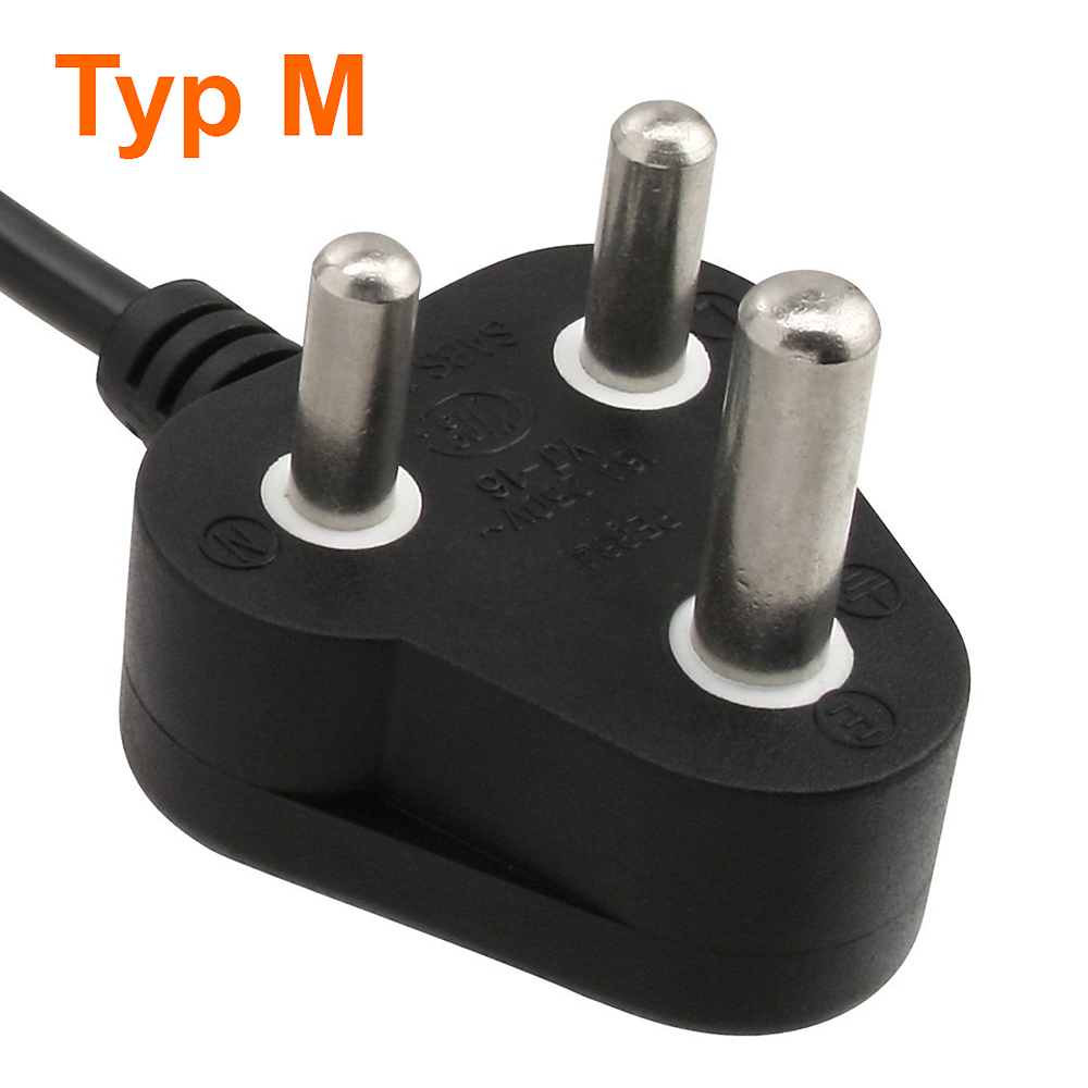 Technischer Hinweis: Alternativ zu dem hier angebotenen Steckertyp M gibt es für Südafrika auch den Steckertyp D, der nahezu identisch aussieht, aber nur für 5 Ampere (statt 10A) ausgelegt ist. Mit dem Steckertyp M sind Sie für Südafrika auf der sicheren Seite. Der D-Typ wird in Afrika und Asien eingesetzt: Äthiopien, Afghanistan, Bangladesch, Bhutan, Botsuana, Dominica, El Salvador, Französisch-Guyana, Ghana, Guadeloupe, Guyana, Indien, Irak, Israel, Jemen, Jordanien, Kongo, Libanon, Libyen, Macao, Madagaskar, Malediven, Martinique, Monaco, Myanmar, Namibia, Nepal, Niger, Nigeria, Pakistan, Katar, Sambia, Senegal, Sierra Leone, Simbabwe, Sri Lanka, St. Kitts und Nevis, Sudan, Südafrika, Tansania, Tschad, Vereinigte Arabische Emirate.