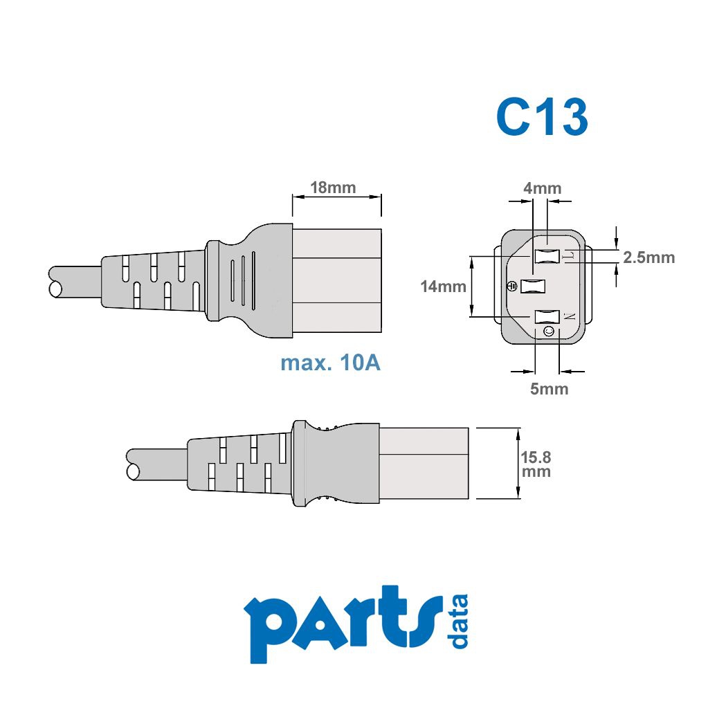 ... werden für den Stromanschluss von Geräten verwendet, die im Betrieb keine bzw. kaum Wärme entwickeln. Diese Anschlussart IEC-60320 C13 ist im IT-Bereich verbreitet, bei professionellen Audio- und Video-Geräten und in der Bühnentechnik. Die maximale Temperatur des Steckers darf 70°C nicht überschreiten und der max. Strom-Durchfluss ist auf 10 A festgelegt.