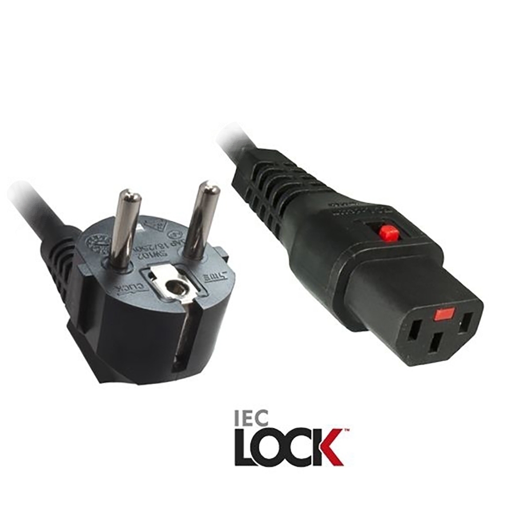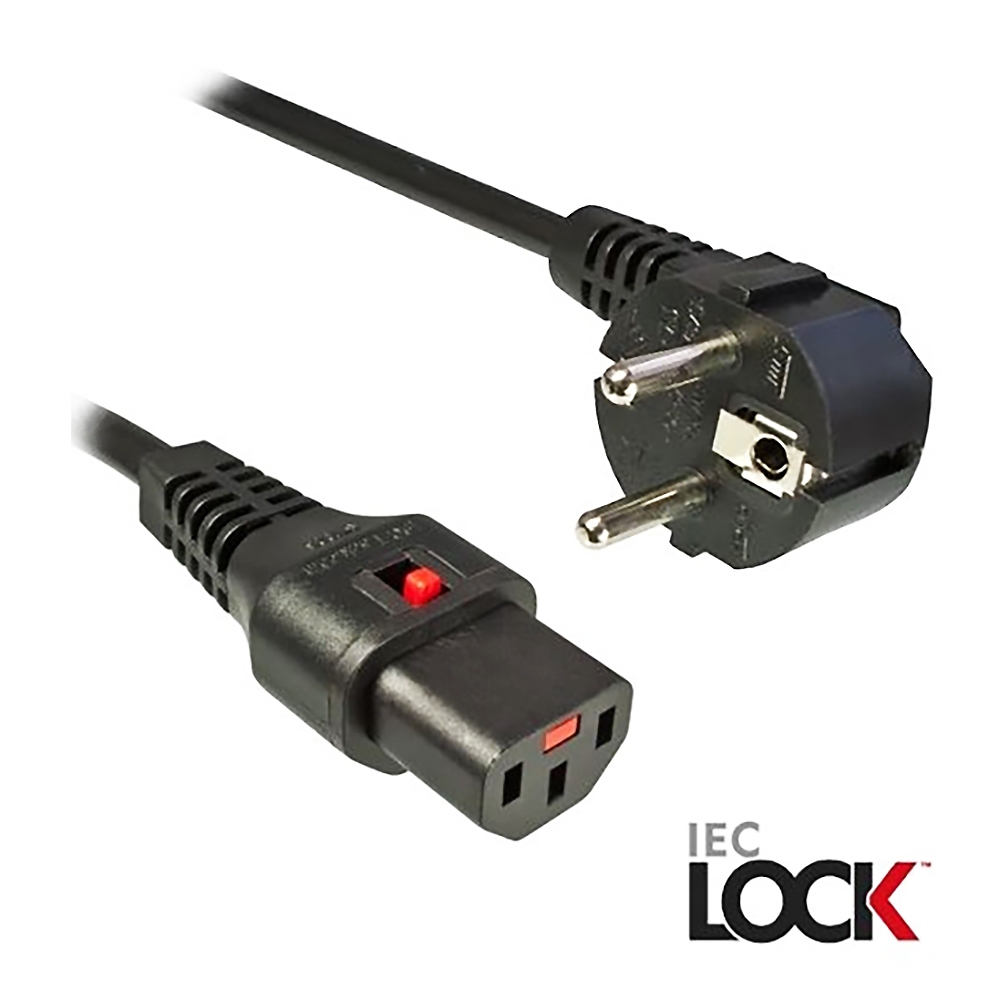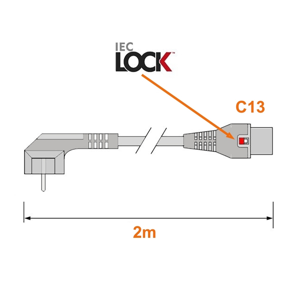 Kaltgerätekabel mit Stecker CEE 7/7 E+F 90° an C13 VERRIEGELBAR IEC-LOCK, 2m