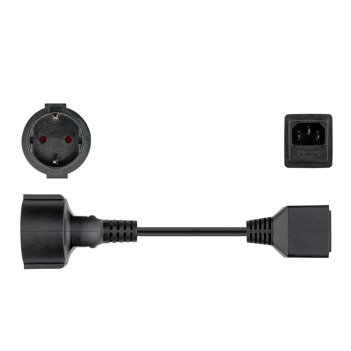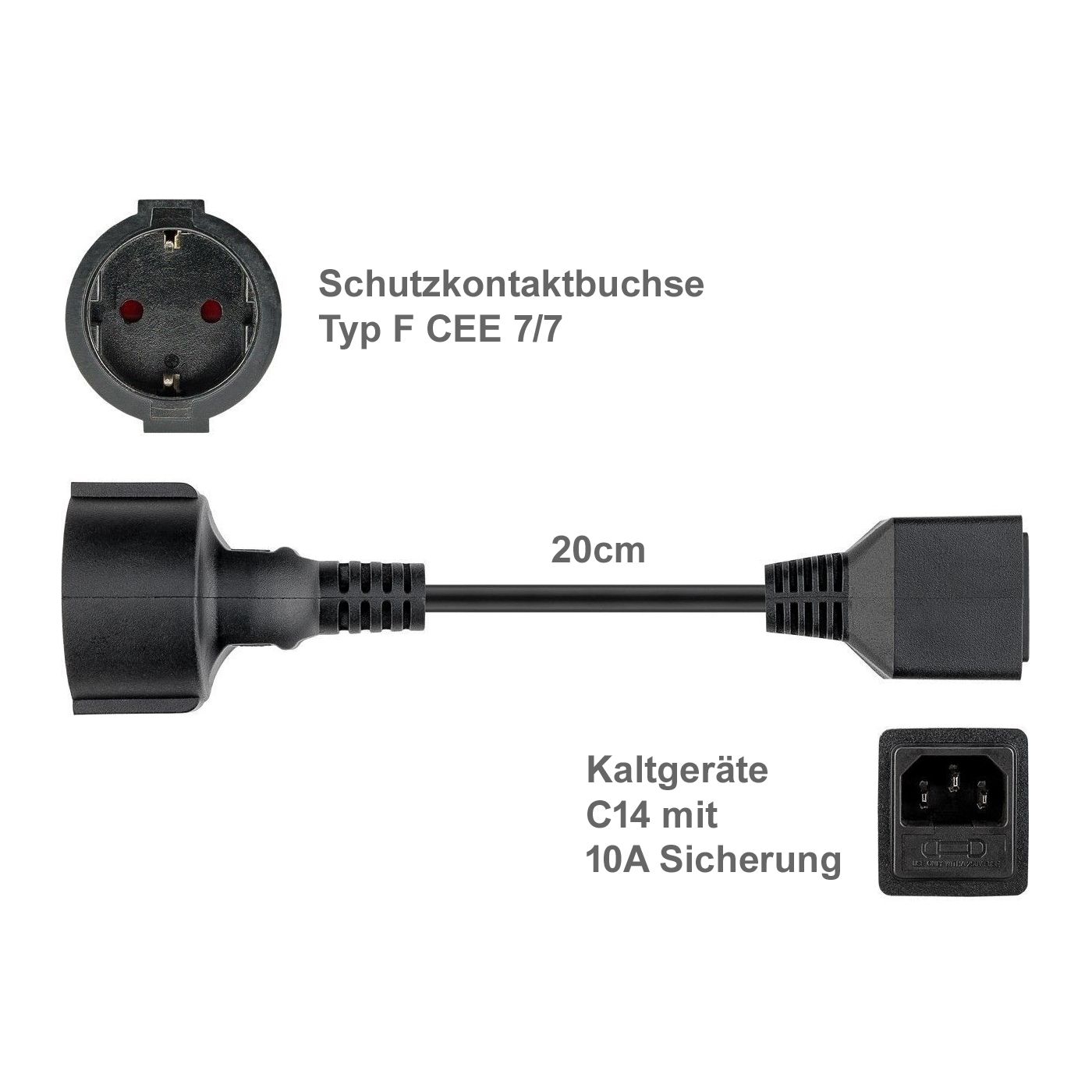 Kurzes Adapterkabel: Kaltgerätestecker C14 (mit eingebauter 10A Sicherung) auf Schutzkontakt-Buchse, Länge ca. 20cm