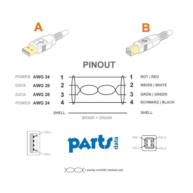 - Datenleitungen paarig verdrillt: "twisted pair"
