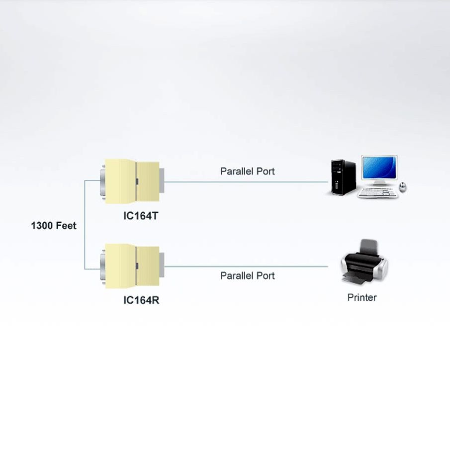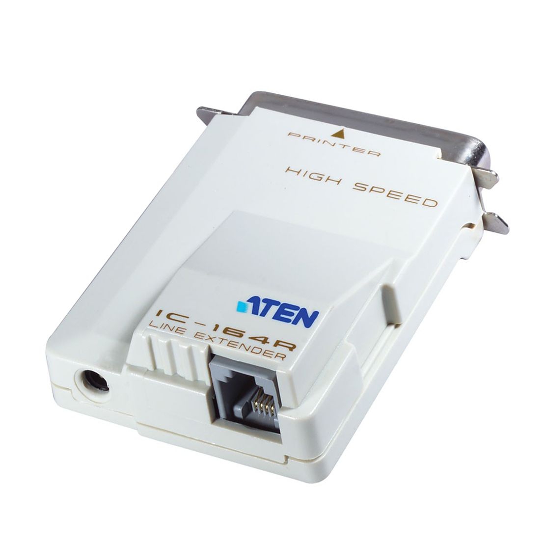 Der ATEN Line-Extender IC-164 eignet sich, um den Parallelport über sehr große Strecken zu verlängern. Er besteht aus einer Empfangseinheit (Modul IC-164R) und einer Sendeeinheit (Modul IC-164T). Die Sendeeinheit wird an den PC, die Empfangseinheit an den Drucker angeschlossen. Die beiden Module werden mit einem 4-poligen Kabel mit RJ-12 Steckern (6P4C) verbunden. Die maximale Kabellänge zwischen der Sende- und Empfangseinheit beträgt ca. 390m.