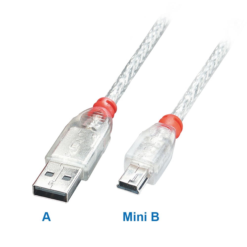 Mini-USB-Kabel 1m, USB-A an Mini-B-Stecker (5-polig), PREMIUM-Qualität von LINDY, Farbe: silber-transparent