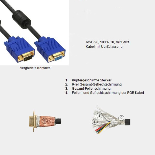 Das High-End-Kabel ist doppelt abgeschirmt und hat drei Koaxialleitungen für RGB. Das heißt, die drei RGB-Farbleitungen des Kabels sind intern nochmals einzeln koaxial abgeschirmt, was einen störungsfreien Betrieb selbst bei großen Kabellängen gewährleistet.