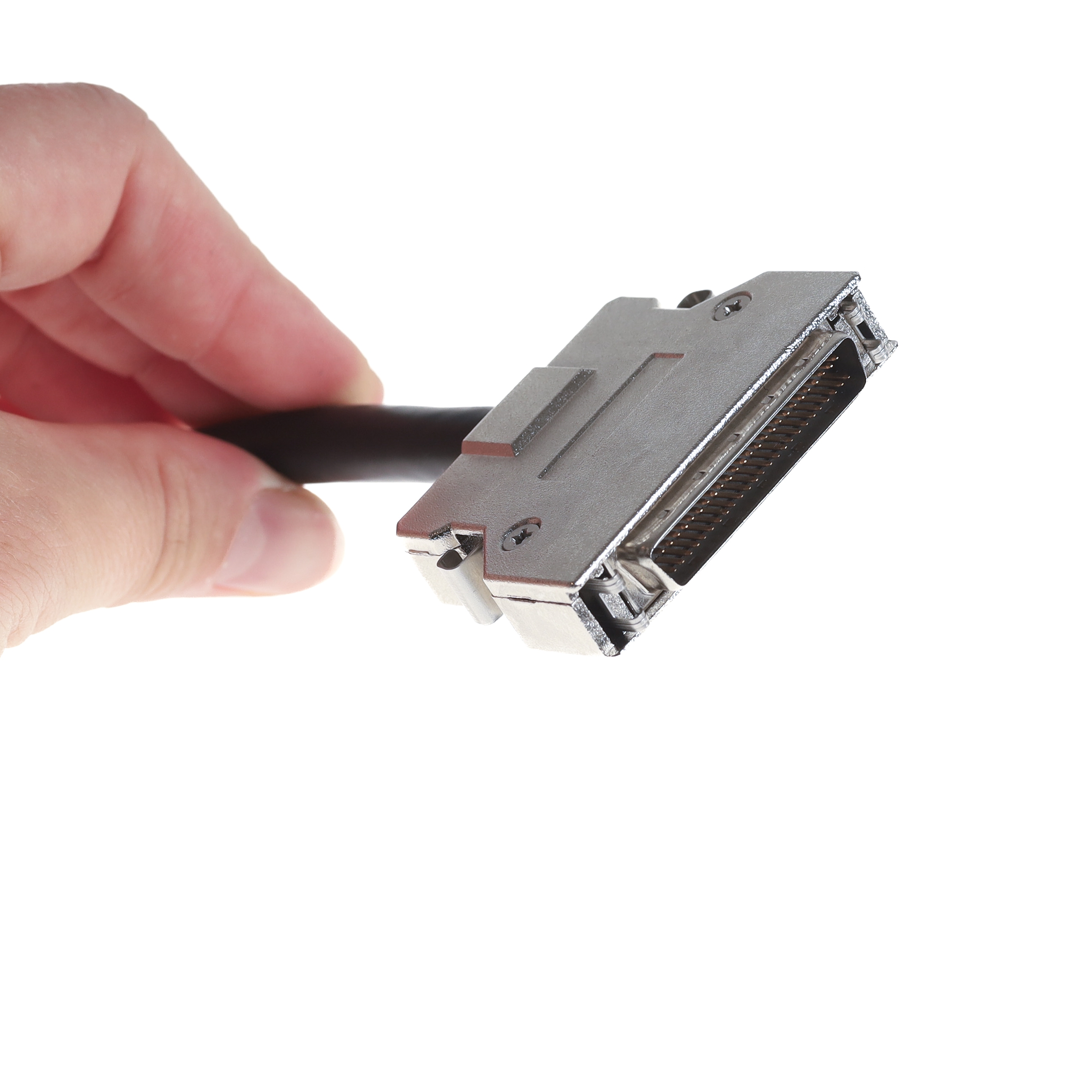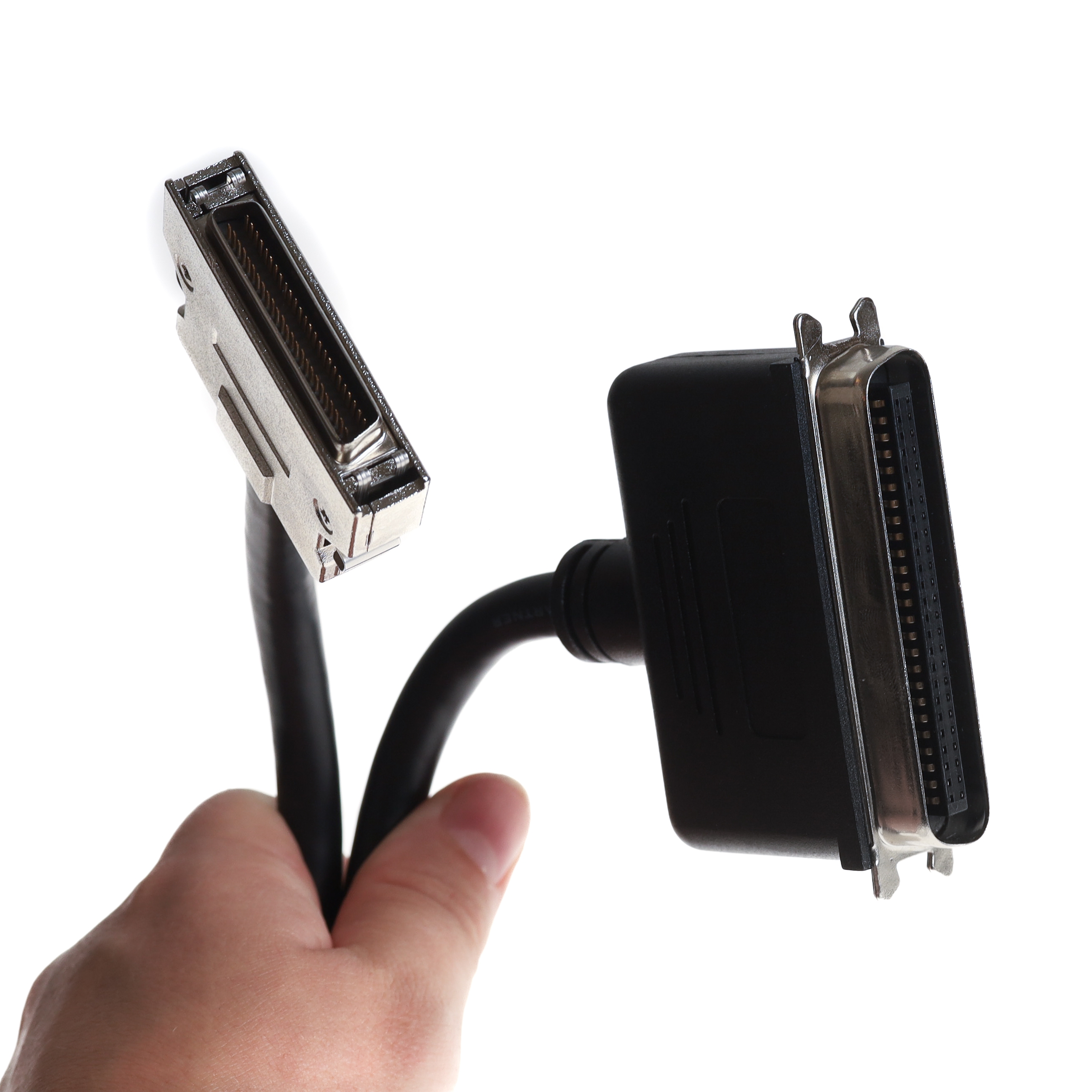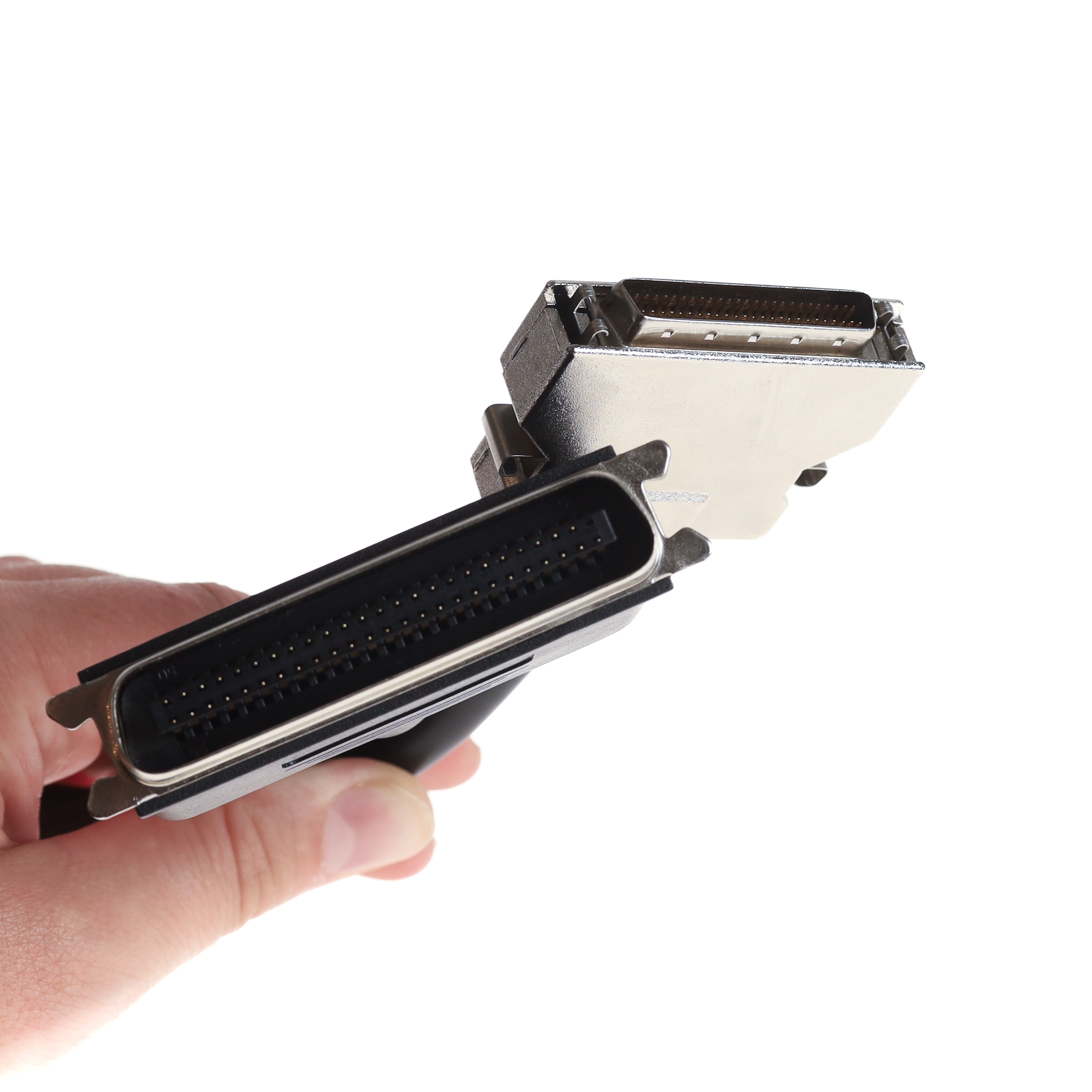 Dieses SCSI-Kabel wird auch als SCSI-2-Kabel bezeichnet. Z.T. findet der Begriff SCSI-2 auch Anwendung für den kleinen Steckertyp HP-DSub-50. Das Kürzel HP steht dabei für "half pitch", halbes Rastermaß. Die Pins des Steckers stehen also nicht im normalen Rastermaß von 2.54mm nebeneinander, sondern 50% enger. Der SCSI-2-Stecker wird mit seitlichen Klips befestigt und nicht geschraubt. Den HP-DSub-50-Anschluss findet man bei der Mehrzahl der SCSI-II-Controller, z.B. am Adaptec 2940U. Auch am ATARI Falcon oder an der D-BOX ist dieser Port. Das hier angebotene Kabel kann z.B. für den Anschluss eines externen SCSI-Festplattengehäuses oder für ein externes CD-ROM verwendet werden. Externe SCSI-Gehäuse haben in der Regel einen großen Centronics-50 Anschluss.