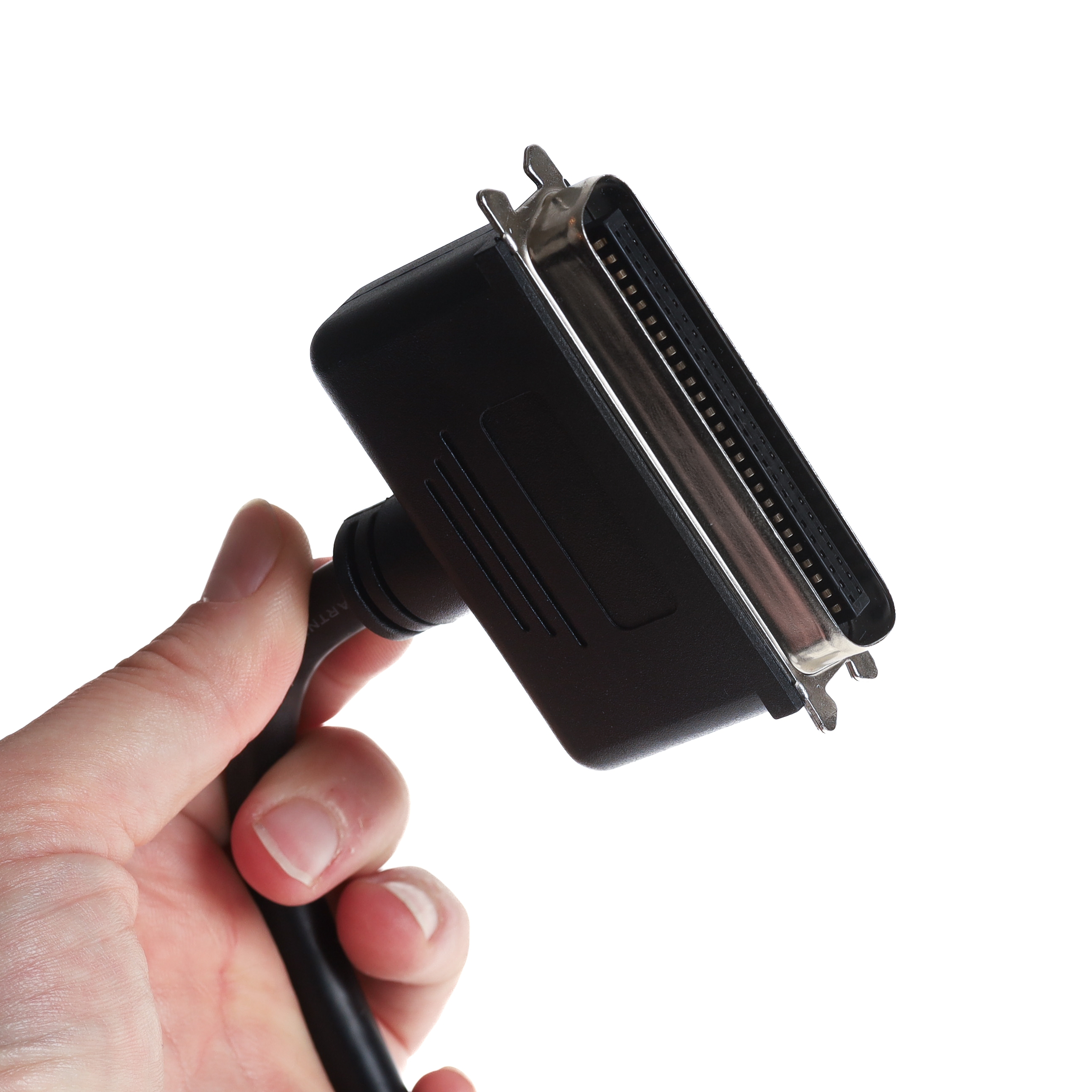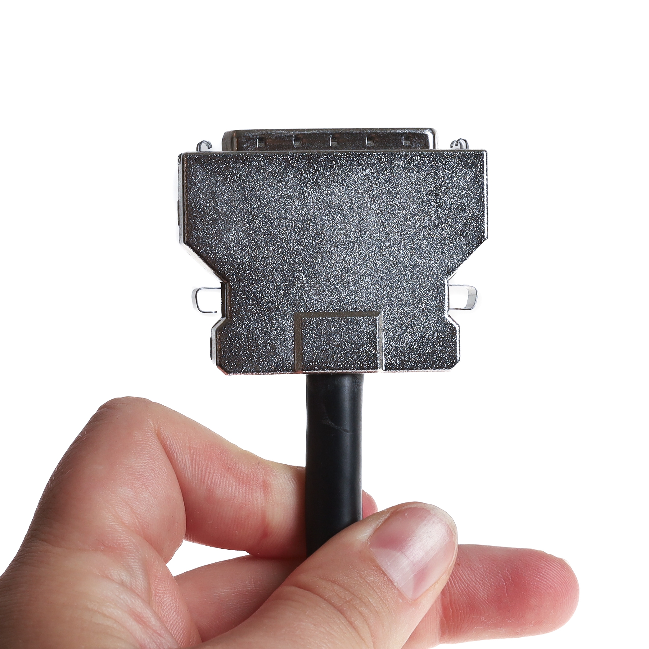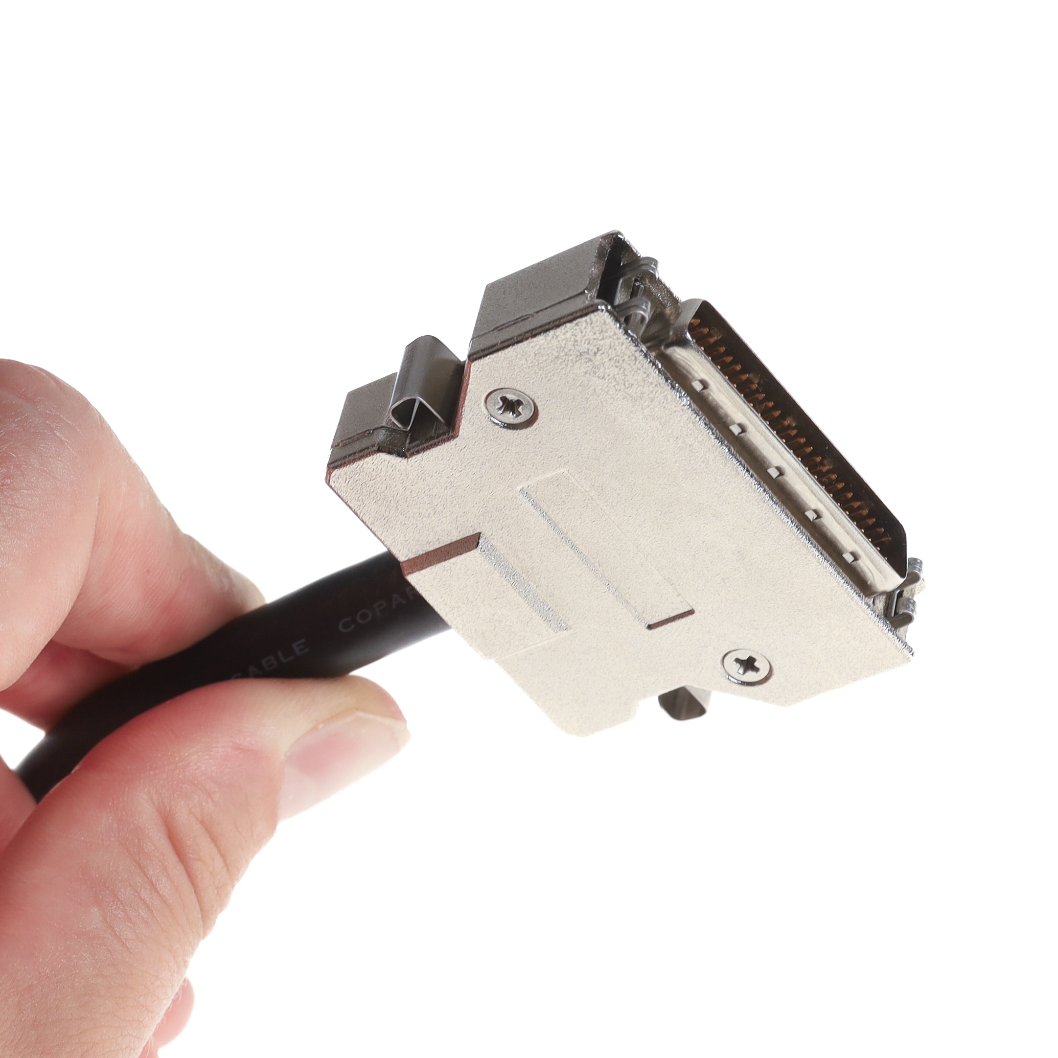 Dieses SCSI-Kabel wird auch als SCSI-2-Kabel bezeichnet. Z.T. findet der Begriff SCSI-2 auch Anwendung für den kleinen Steckertyp HP-DSub-50. Das Kürzel HP steht dabei für "half pitch", halbes Rastermaß. Die Pins des Steckers stehen also nicht im normalen Rastermaß von 2.54mm nebeneinander, sondern 50% enger. Der SCSI-2-Stecker wird mit seitlichen Klips befestigt und nicht geschraubt. Den HP-DSub-50-Anschluss findet man bei der Mehrzahl der SCSI-II-Controller, z.B. am Adaptec 2940U. Auch am ATARI Falcon oder an der D-BOX ist dieser Port. Das hier angebotene Kabel kann z.B. für den Anschluss eines externen SCSI-Festplattengehäuses oder für ein externes CD-ROM verwendet werden. Externe SCSI-Gehäuse haben in der Regel einen großen Centronics-50 Anschluss.
