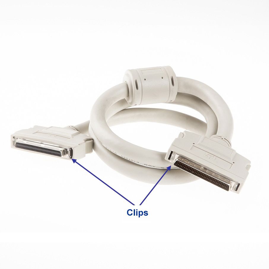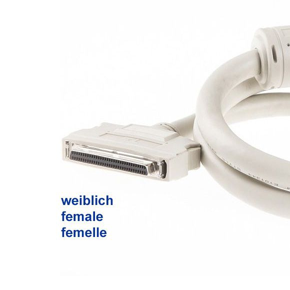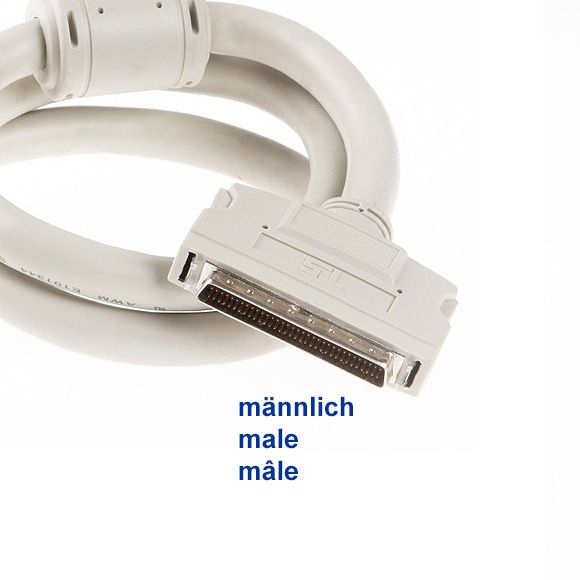 Bitte beachten Sie, dass beide Stecker seitlich keine Schrauben sondern Klemmen besitzen. Diese besondere Klemm-Steckerart war in Europa bei 68-poligen SCSI-Kabeln nie sehr verbreitet. Meist kommen bei 68-poligen SCSI-Kabeln in Europa Schrauben zum Einsatz. Das Kabel ist z.B. für ältere Meßinstrumente von National Instruments geeignet.