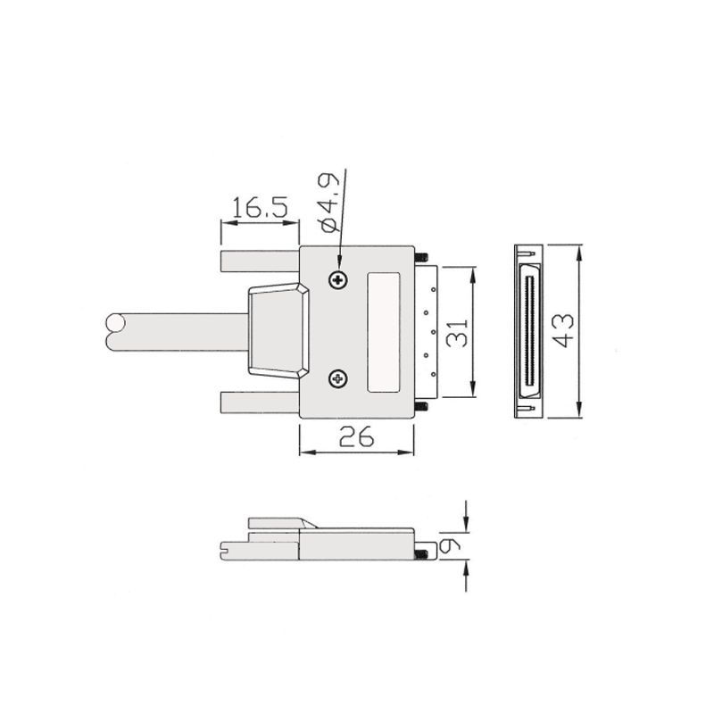 Das SCSI-Kabel hat beidseitig die kleinen, kompakten VHDCI-Stecker. Dieser Steckertyp besitzt mittig einen feinen Kontaktsteg (keine Kontaktstifte). Die Kontakte sind im Abstand von 0,8mm. Z.T. wird in der Branche auch von Mini-Centronics gesprochen.