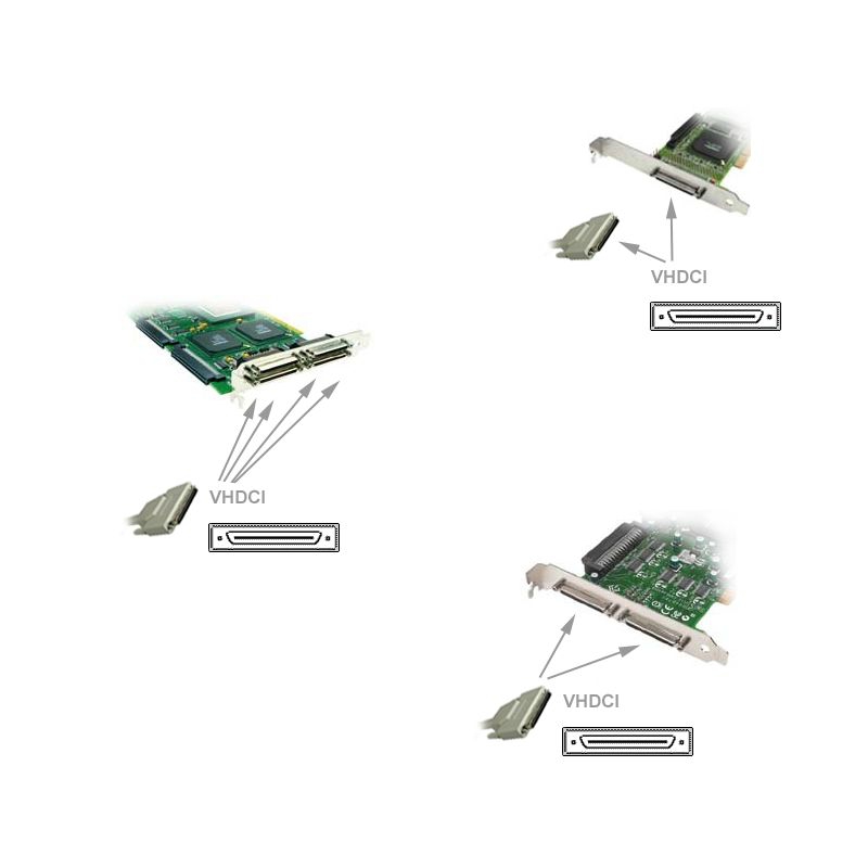 ... steht für "Very High Density Cable Interconnect". SCSI-Controller mit 2 oder mehr externen Anschlüssen haben in der Regel diese kleinen 68-poligen VHDCI-Buchsen. Der VHDCI-Stecker kann links und rechts neben der Buchse mit Schrauben befestigt werden (keine Klemmen).