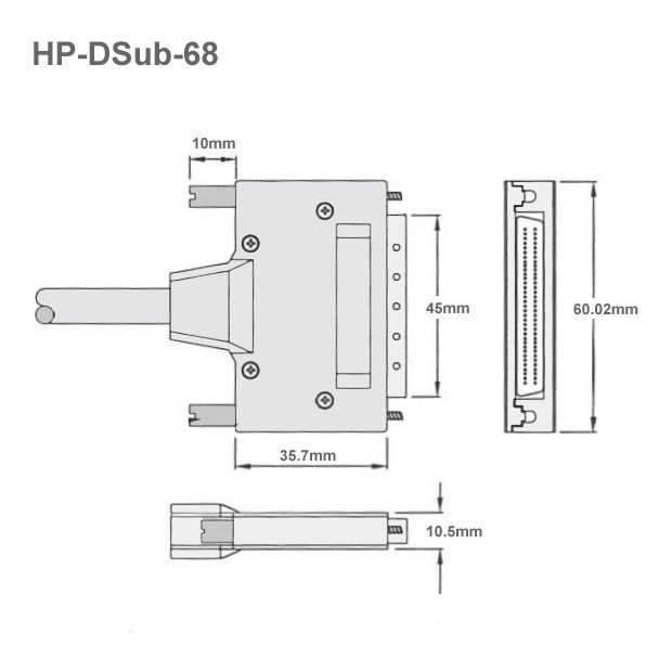 - HP-DSub-68 (HP-DB68) männlich mit 68 feinen Kontaktstiften in 2 Reihen (Pitch 1.27mm)