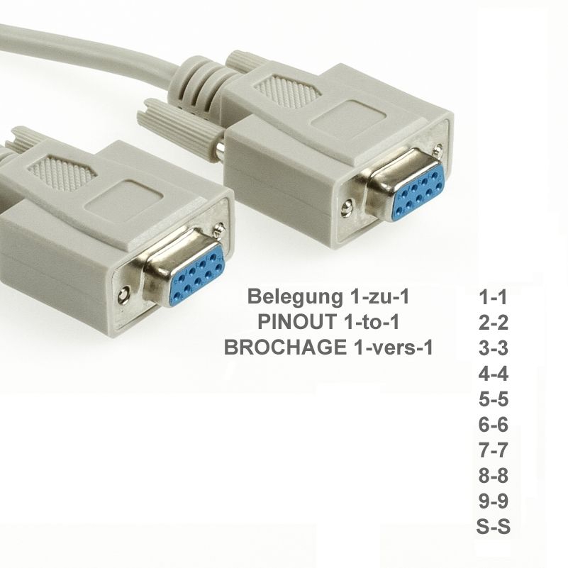 Das Kabel ist kein NULL-Modem-Kabel. Diese Spezialkabel mit spezieller Belegung haben wir allerdings ebenfalls im Programm, z.B. partsdata Art.-Nr. CNULL-100 (2m), CNULL-101 (3m) und CNULL-102 (5m).