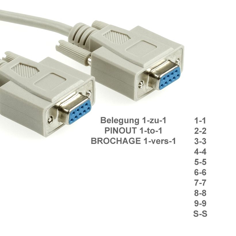 - alle 9 Kontakte 1-zu-1 verbunden (kein NULL-Modem)