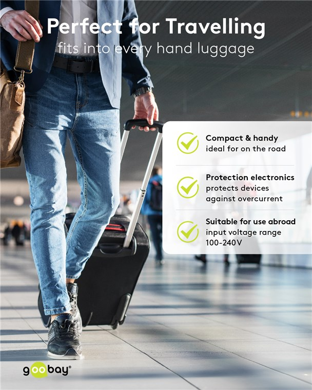 Mit superflacher Bauform und Euro-Stecker ist das Ladegerät der ideale Begleiter für unterwegs.