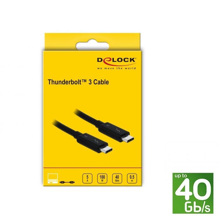 Dieses Thunderbolt™ 3 Kabel von DELOCK ist universell einsetzbar und vereint alle Vorteile der Thunderbolt™ 3 Schnittstelle. Es ermöglicht den Anschluss unterschiedlicher Geräte, wie z. B. externer Gehäuse, Monitore, Card Reader und Docking Stationen, über einen Thunderbolt™ 3 Port eines PCs oder Notebooks. Das Kabel ermöglicht Datenübertragungsraten von bis zu 40 Gb/s und unterstützt sowohl die Übertragung von USB als auch von DisplayPort, PCI Express und Ethernet Daten. So ist z. B. der Anschluss eines 5K oder von zwei 4K DisplayPort Monitoren möglich, ebenso der Anschluss von USB 3.1 Gen 2 Geräten. Auch die Stromversorgung von angeschlossenen Geräten mit einer Leistung bis zu 100 W ist möglich.