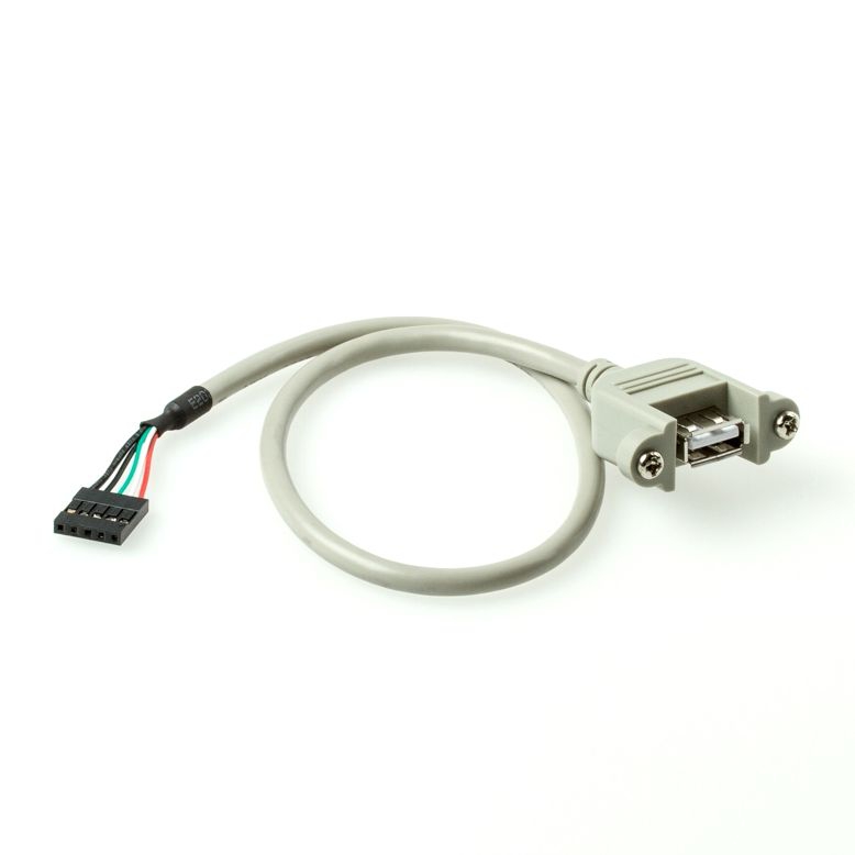 Die Buchse des Montagekabels (Typ A weiblich) ist anschraubbar. Die Schrauben sich im Lieferumfang enthalten und vormontiert. Auf der anderen Seite des Kabels befindet sich ein 5-poliger Stecker für ein Pfostenfeld (sogenannter Pfostenfeldverbinder oder Boardstecker). Das Rastermaß des Boardsteckers ist 2,54mm und entspricht damit den Erfordernissen der meisten Mainboards oder AddOn-Karten.