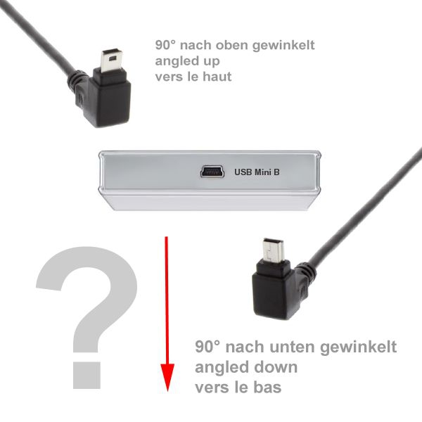 Wir bezeichnen das Kabel als 90° NACH UNTEN gewinkelt. Ob NACH UNTEN auch bei Ihnen stimmt, ist von der Position der Mini B USB-Buchse des Gerätes abhängig. Bitte prüfen Sie daher die Ausrichtung der Mini-B-Buchse Ihres USB-Gerätes. Diese Buchse ist trapezförmig, eine Seite ist breiter, die andere schmaler.