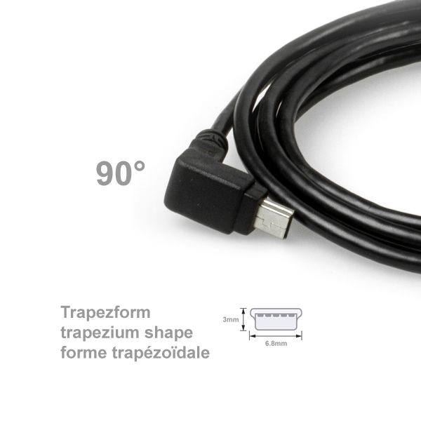 Wir bezeichnen das Kabel als 90° NACH UNTEN gewinkelt. Ob NACH UNTEN auch bei Ihnen stimmt, ist von der Position der Mini B USB-Buchse des Gerätes abhängig. Bitte prüfen Sie daher die Ausrichtung der Mini-B-Buchse Ihres USB-Gerätes. Diese Buchse ist trapezförmig, eine Seite ist breiter, die andere schmaler.