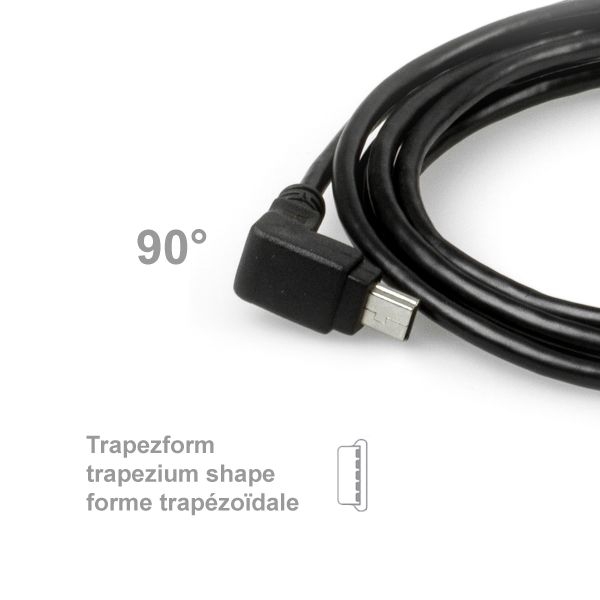 Wir bezeichnen das Kabel als 90° NACH UNTEN gewinkelt. Ob NACH UNTEN auch bei Ihnen stimmt, ist von der Position der Mini B USB-Buchse des Gerätes abhängig. Bitte prüfen Sie daher die Ausrichtung der Mini-B-Buchse Ihres USB-Gerätes. Diese Buchse ist trapezförmig, eine Seite ist breiter, die andere schmaler.