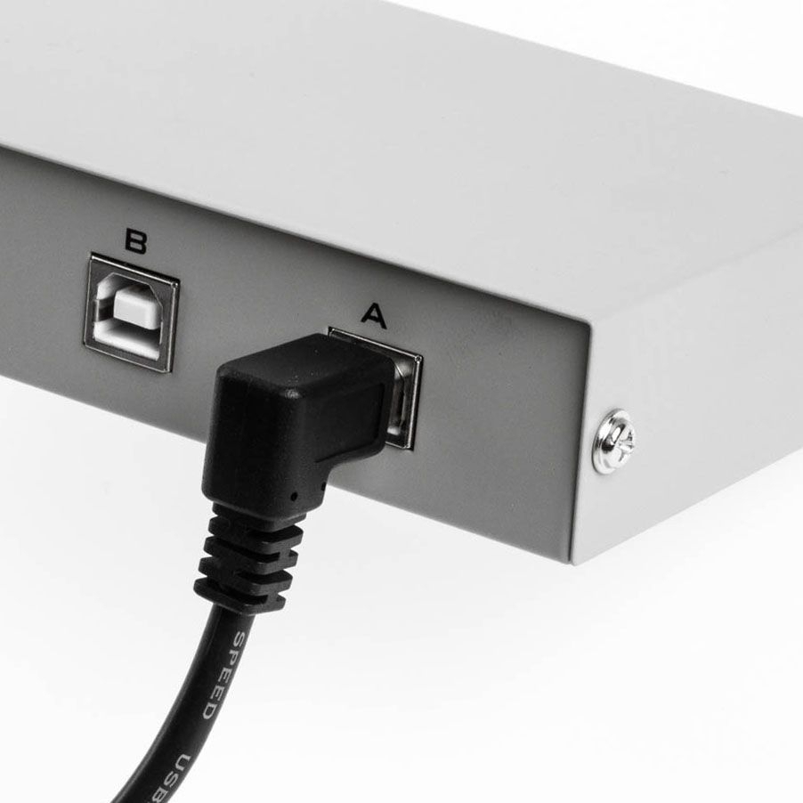 Das USB 2.0 Kabel hat einen um 90° abgewinkelten USB-Stecker Typ B für den platzsparenden Anschluss von USB-Einheiten.