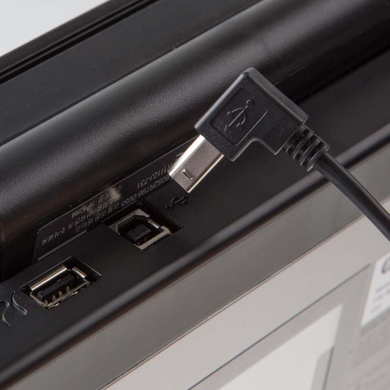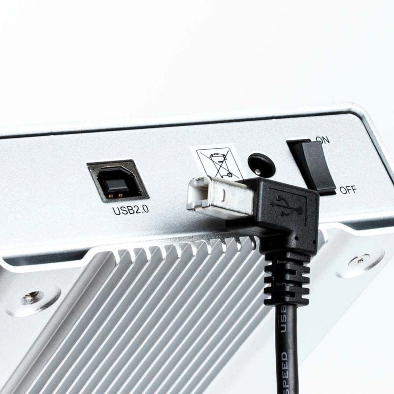 Das USB 2.0 Kabel hat einen um 90° abgewinkelten USB-Stecker Typ B für den platzsparenden Anschluss von USB-Einheiten.