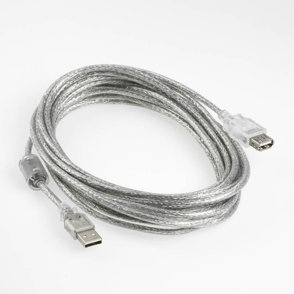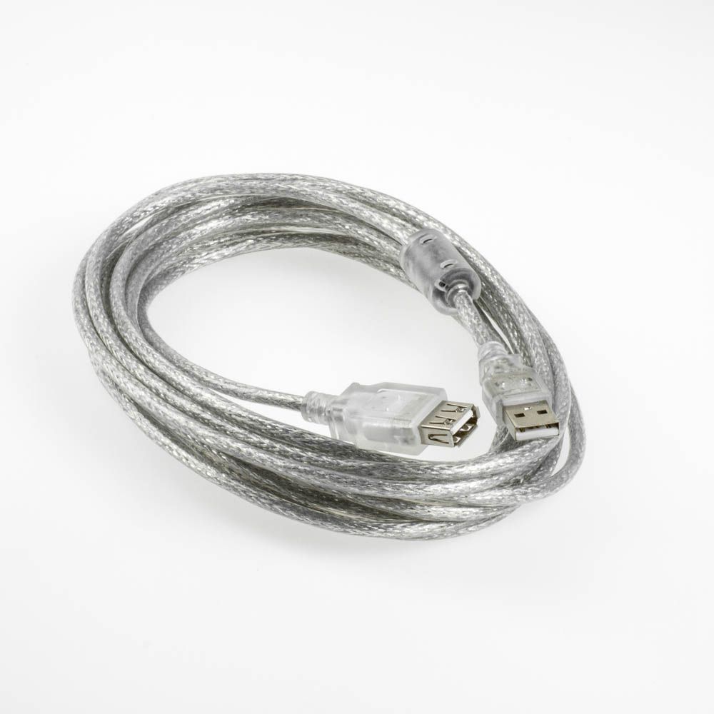 USB 2.0 Verlängerungskabel mit FERRITKERN, 5m, Typ: AA Stecker/Buchse, für USB 1.1 und USB 2.0 (bis 480 MBit/s), Farbe: transparent-silber