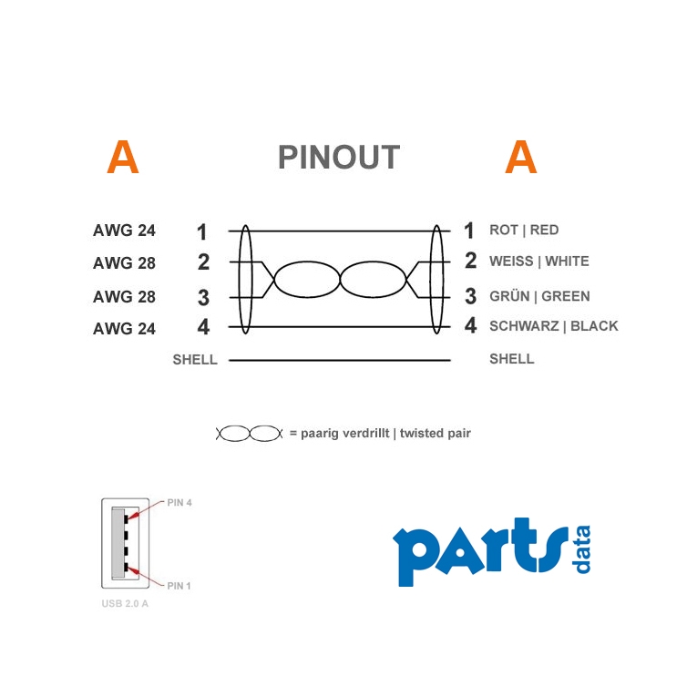 - Datenlitzen: AWG28/1P, Kupfer (CU), paarig verdrillt (twisted pair)