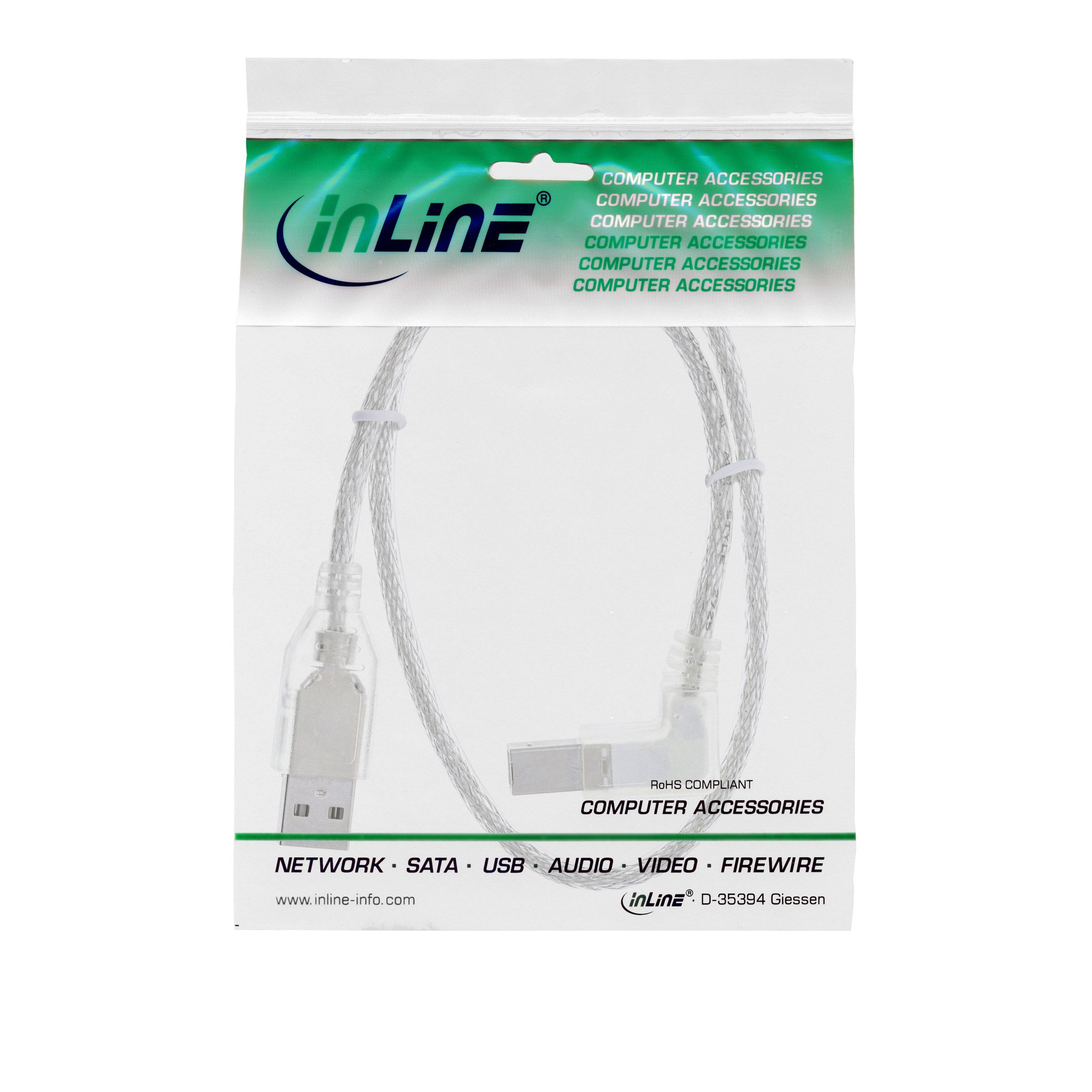 USB 2.0 Kabel mit 90° abgewinkeltem B-Stecker (nach LINKS), 50cm, PREMIUM-Qualität: 28AWG/1P (data) 24AWG/2C (power), doppelt geschirmt, Farbe: silber-transparent