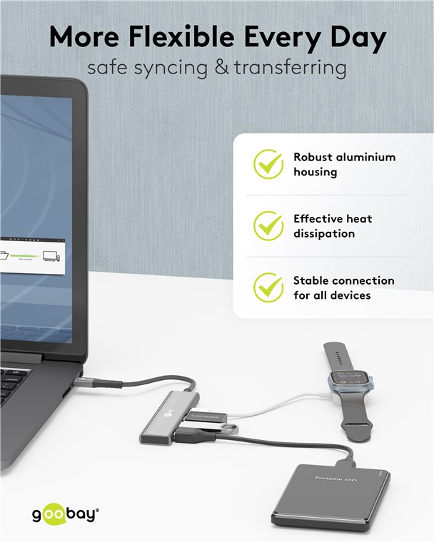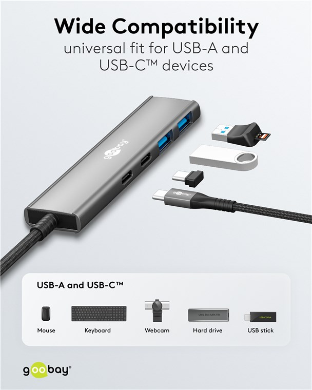 - Im kompakten Slim-Format passt der USB-C™-Hub in jede Tasche und wird unterwegs oder auf Reisen zum praktischen Begleiter