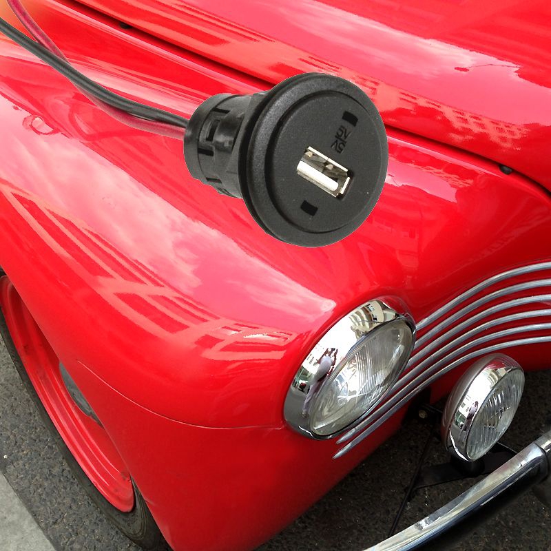 Mit dieser Einbausteckdose können Sie professionell eine USB-Ladebuchse in Ihrem Auto, LKW, Wohnmobil oder Boot nachrüsten. Das rückwärtige, 2-polige Kabel wird einfach an das 12V Bordnetz angeklemmt. Rot ist Plus.