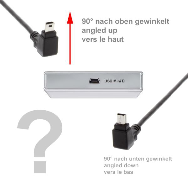 Wir bezeichnen das Kabel als 90° NACH OBEN gewinkelt. Ob NACH OBEN auch bei Ihrer Anwendung stimmt, ist von der Position der Mini B USB-Buchse des Gerätes abhängig. Bitte prüfen Sie daher die Lage der Mini-B-Buchse Ihres USB-Gerätes. Die Buchse ist trapezförmig. Eine Seite ist länger, die andere kürzer.