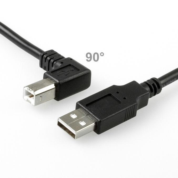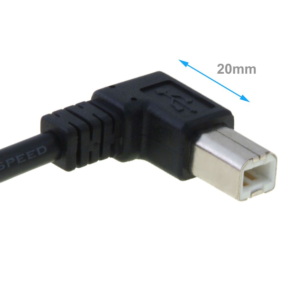 Das hier angebotene USB-Kabel hat einen um 90° abgewinkelten USB-Stecker Typ B. Dadurch eignet sich das Kabel besonders für den platzsparenden Anschluss von USB-Geräten. Der Stecker-Überstand ist nur ca. 20mm.