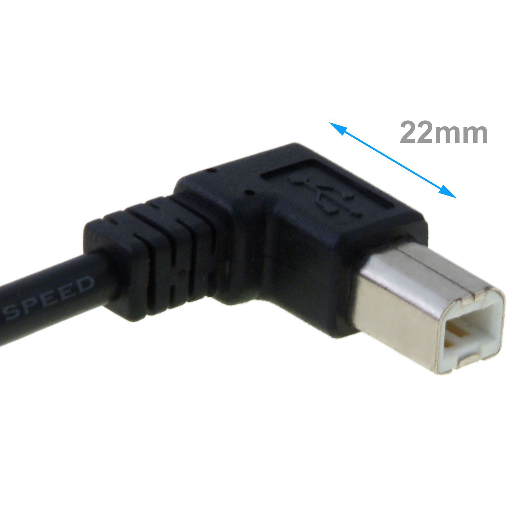 Das hier angebotene USB-Kabel hat einen um 90° abgewinkelten USB-Stecker Typ B. Dadurch eignet sich das Kabel besonders für den platzsparenden Anschluss von USB-Geräten. Der Stecker-Überstand ist nur ca. 22mm.