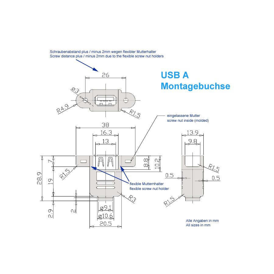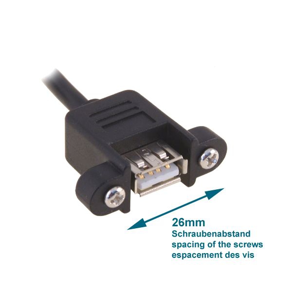 Die Buchse des USB 2.0 Panel-Montagekabels (Typ A weiblich) ist anschraubbar. Die Muttern sind seitlich eingegossen. Als Schraubentyp wird UNC 4/40 verwendet, der im Computerbereich meistverwendete Gewindetyp. Der Schraubenabstand beträgt 26mm. Mit diesem Schraubenabstand sind bei partsdata zahlreiche andere USB-Montagekabel verfügbar.